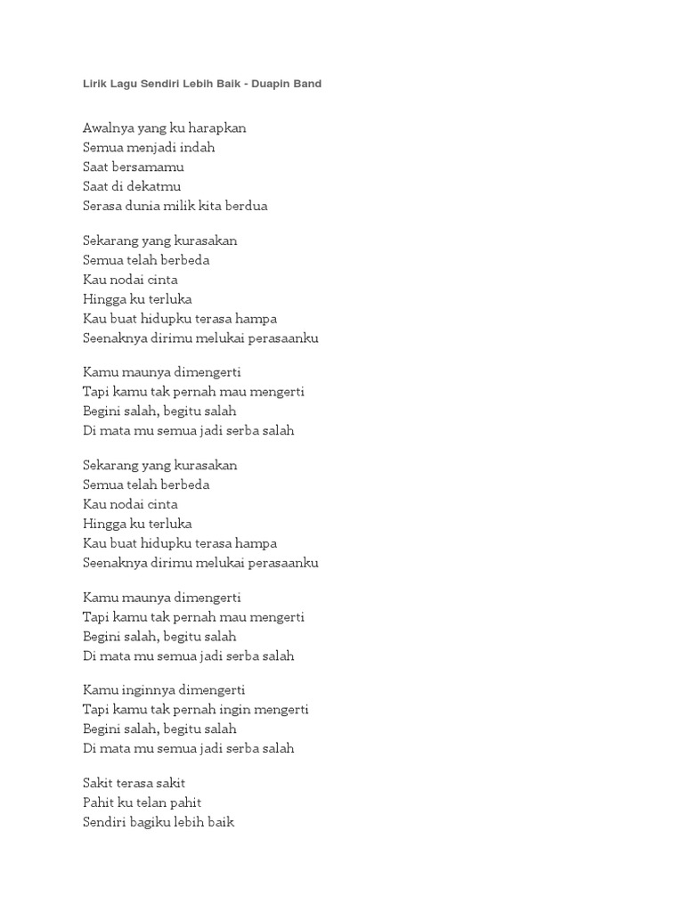 .lebih indah lebih baik aku sendiri dulu sampai ku temukan pangeran cintaku akan ku pilih yang terbaik dialah yang pantas mendampingi aku lebih. Lagu utamanya ialah kamu bilang. Dengan demikian anda akan selalu siap menghadapi kondisi yang berbeda atau bersyukur adalah cara yang efektif dalam upaya menjadikan diri anda lebih baik. Home / hexa / lebih baik sendiri. Lirik lagu lebih baik sendiri mp3 terpopuler full album terlengkap.
